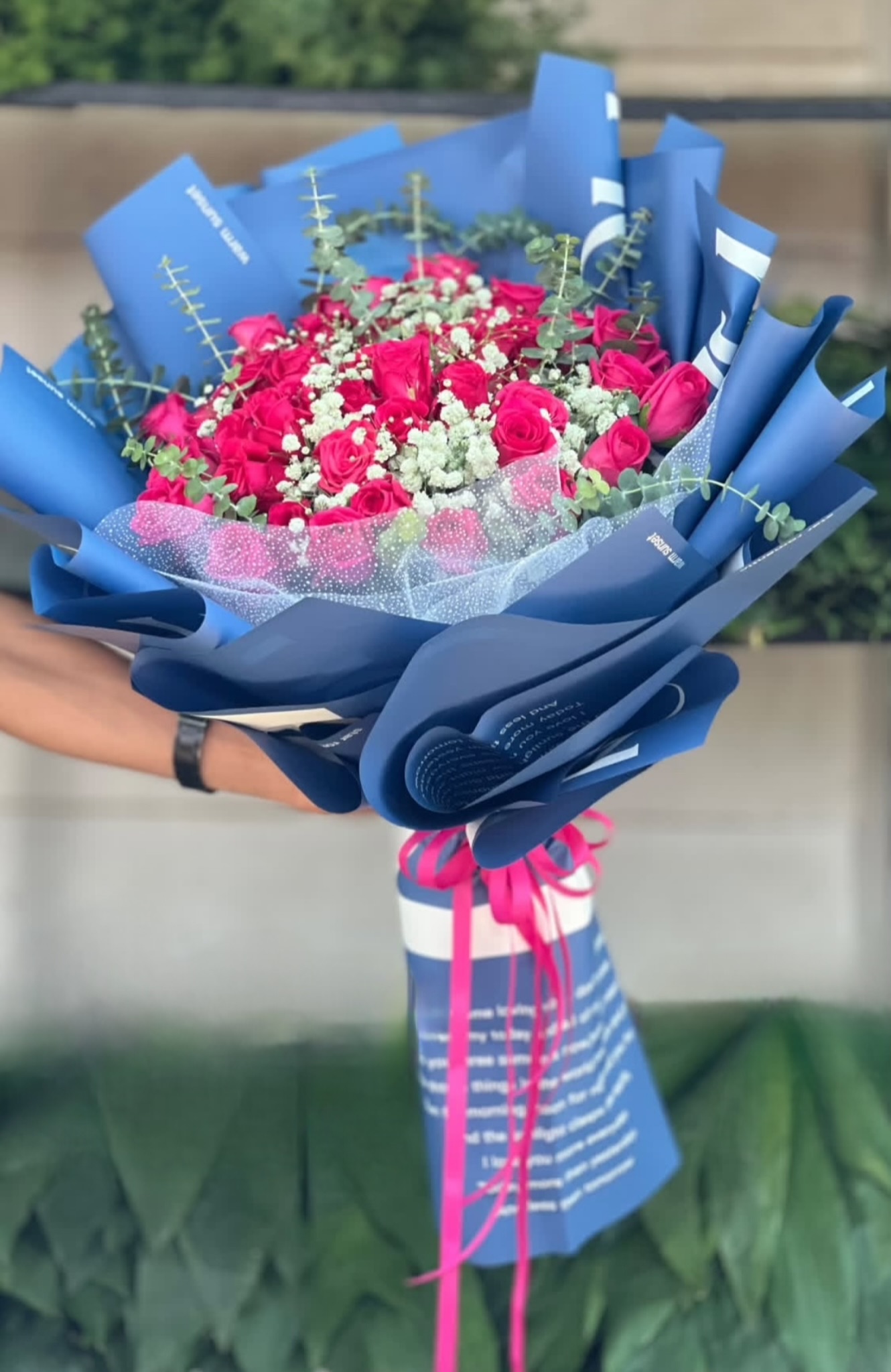 دسته گل ۴۰ شاخه رز قرمز فلوبار