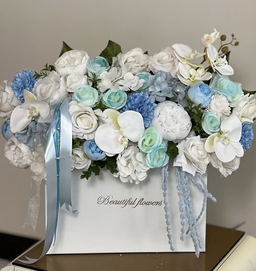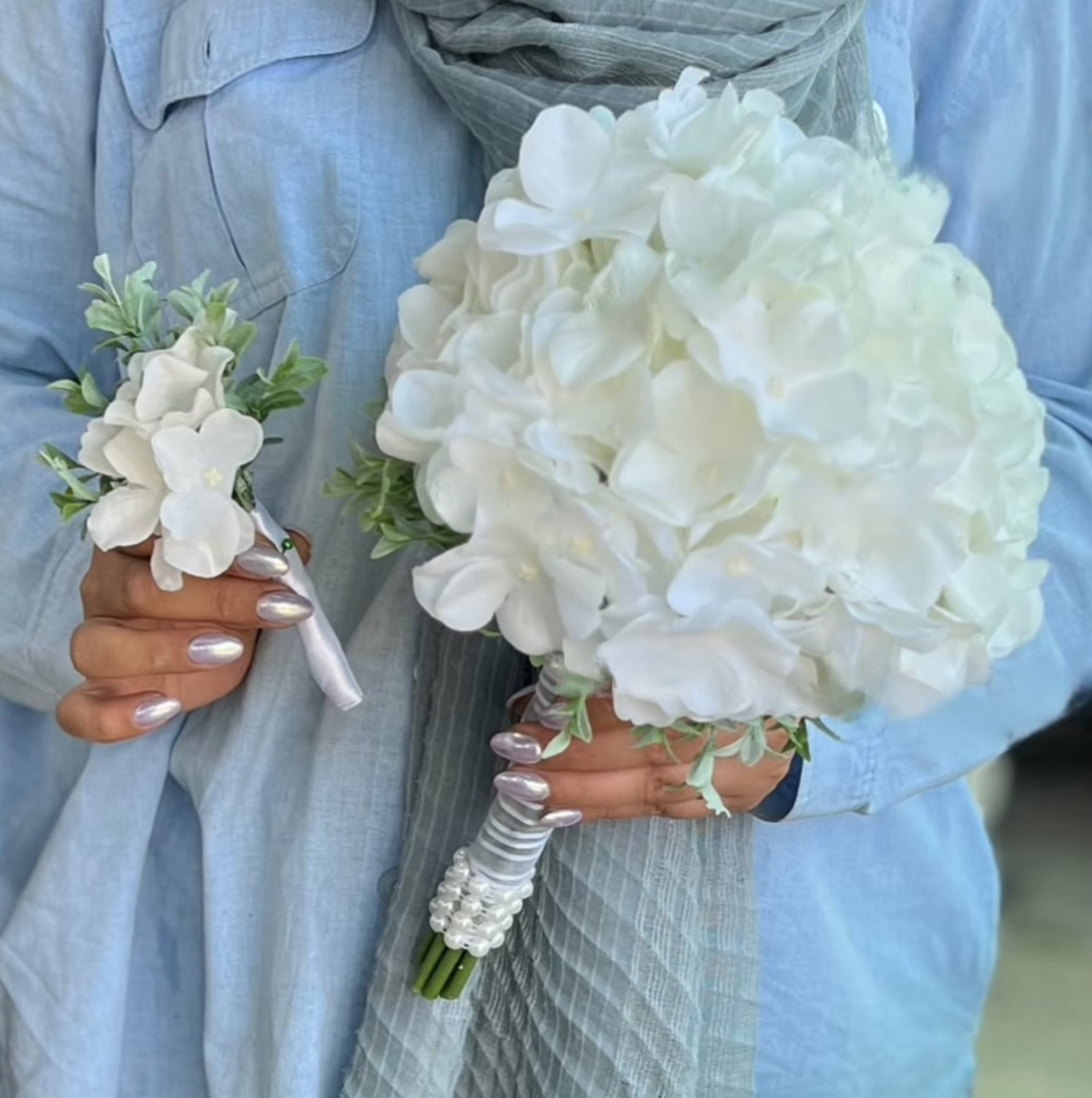 دسته گل عروس با گل هورتانسیا مصنوعی فلوبار