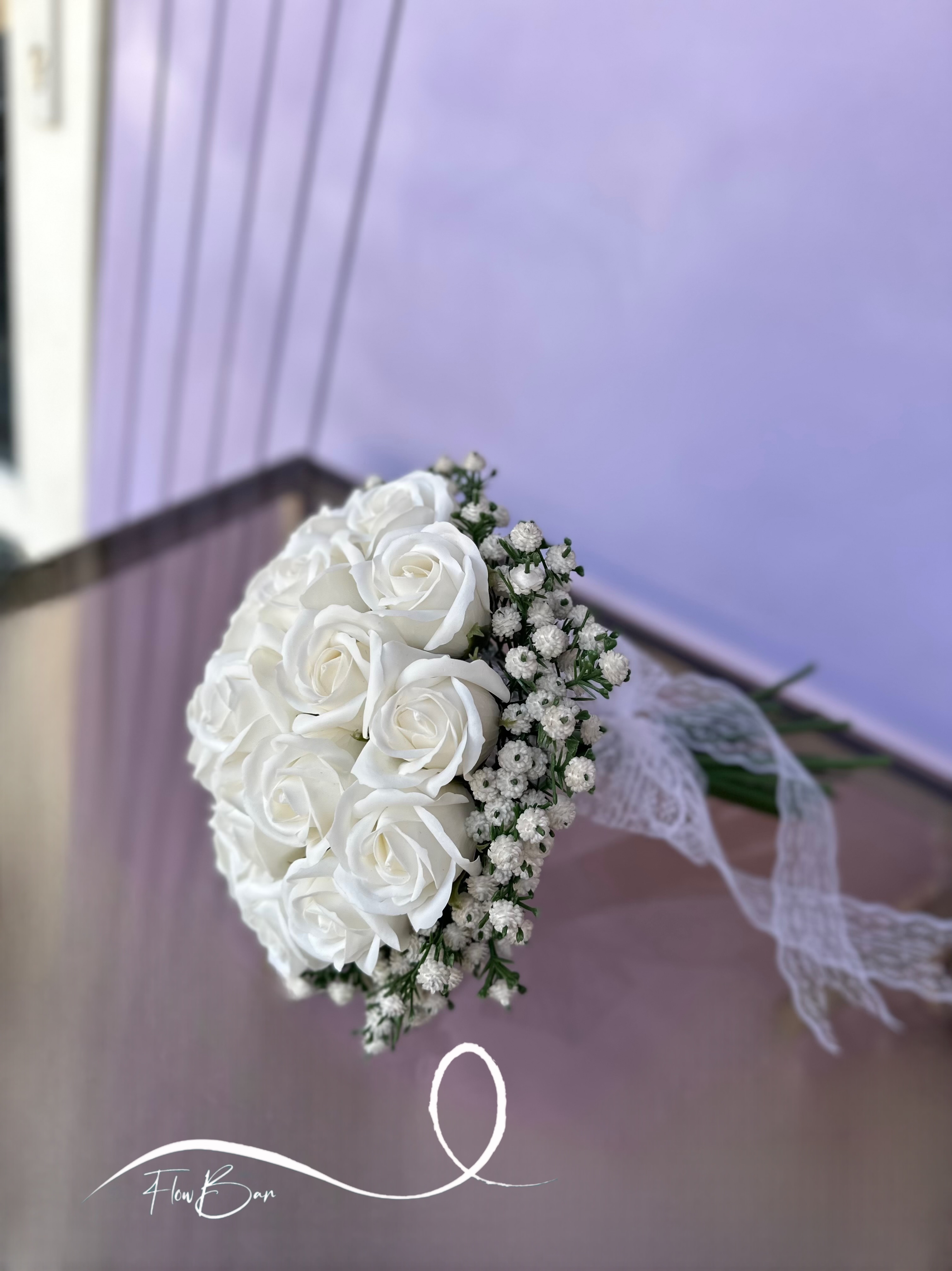دسته گل عروس با گل رز مصنوعی فلوبار
