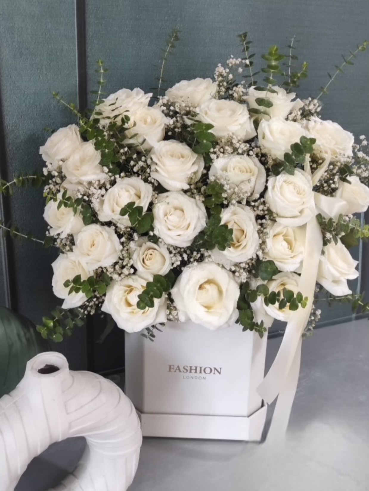باکس گل غول پیکر رز سفید و اکالیپتوس فلوبار