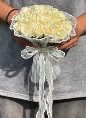 دسته گل عروس با رز سفید فلوبار