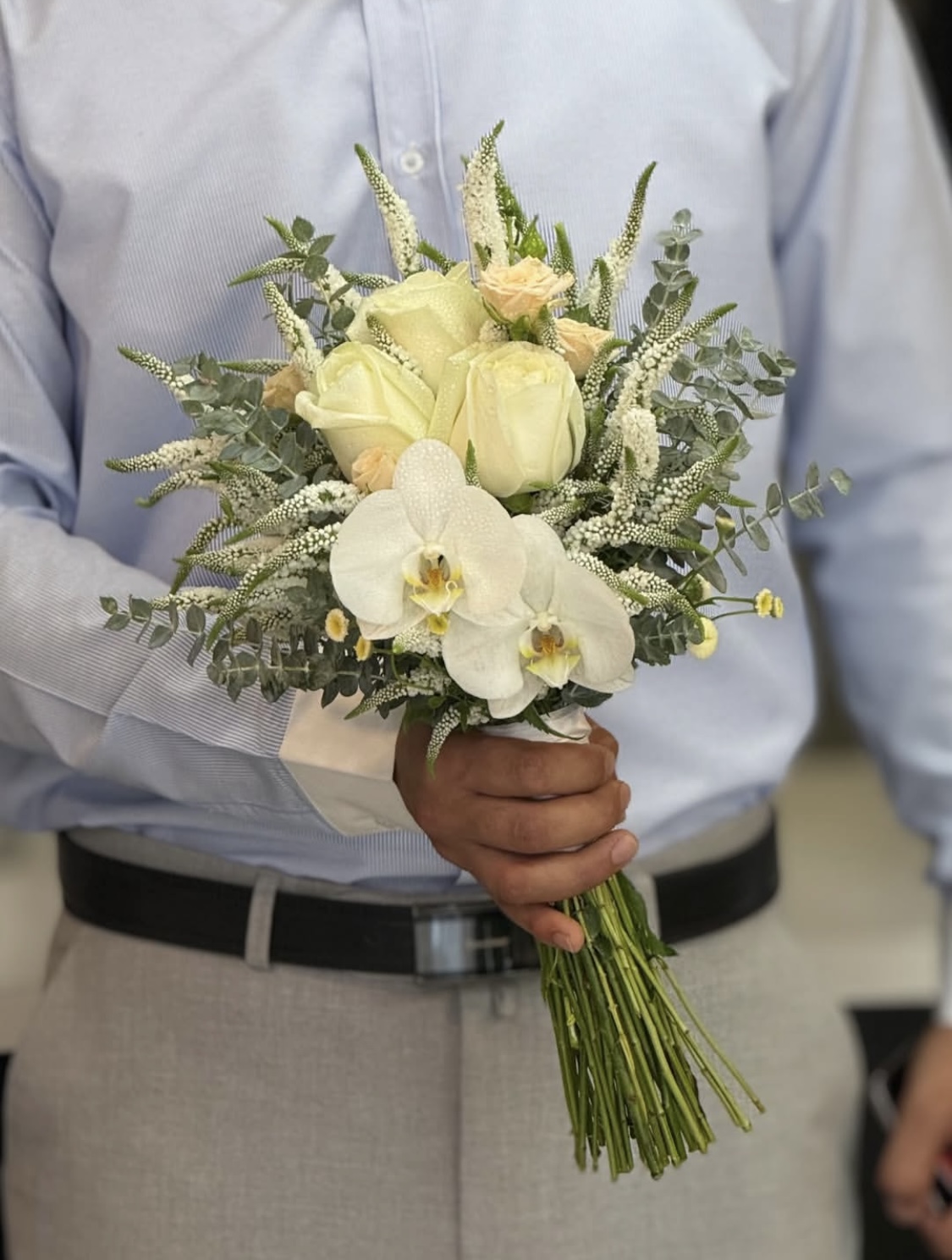 دسته گل عروس با رز سفید فلوبار