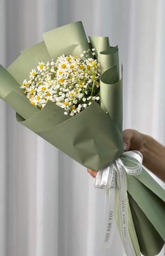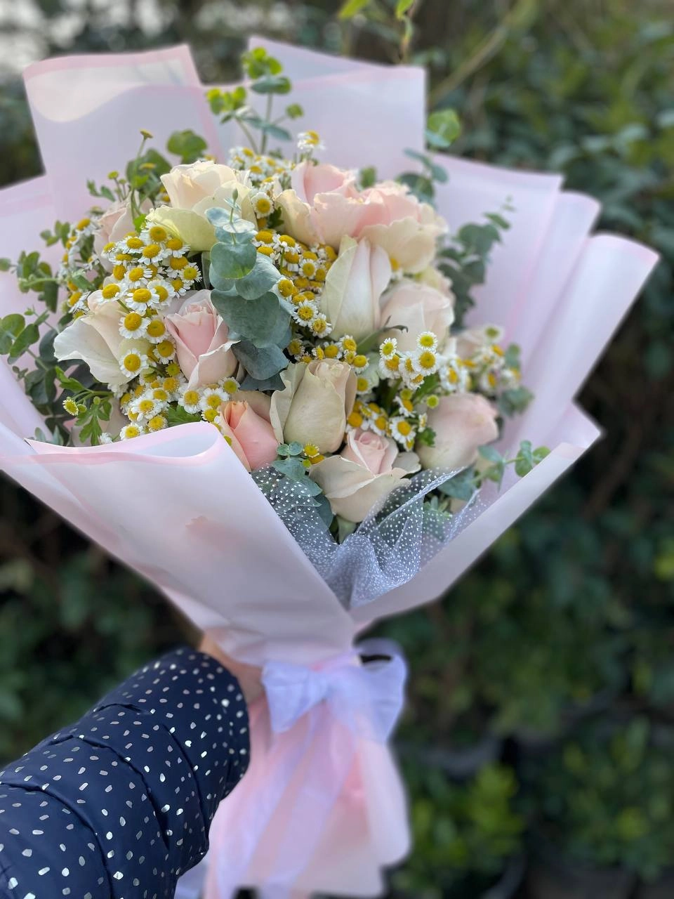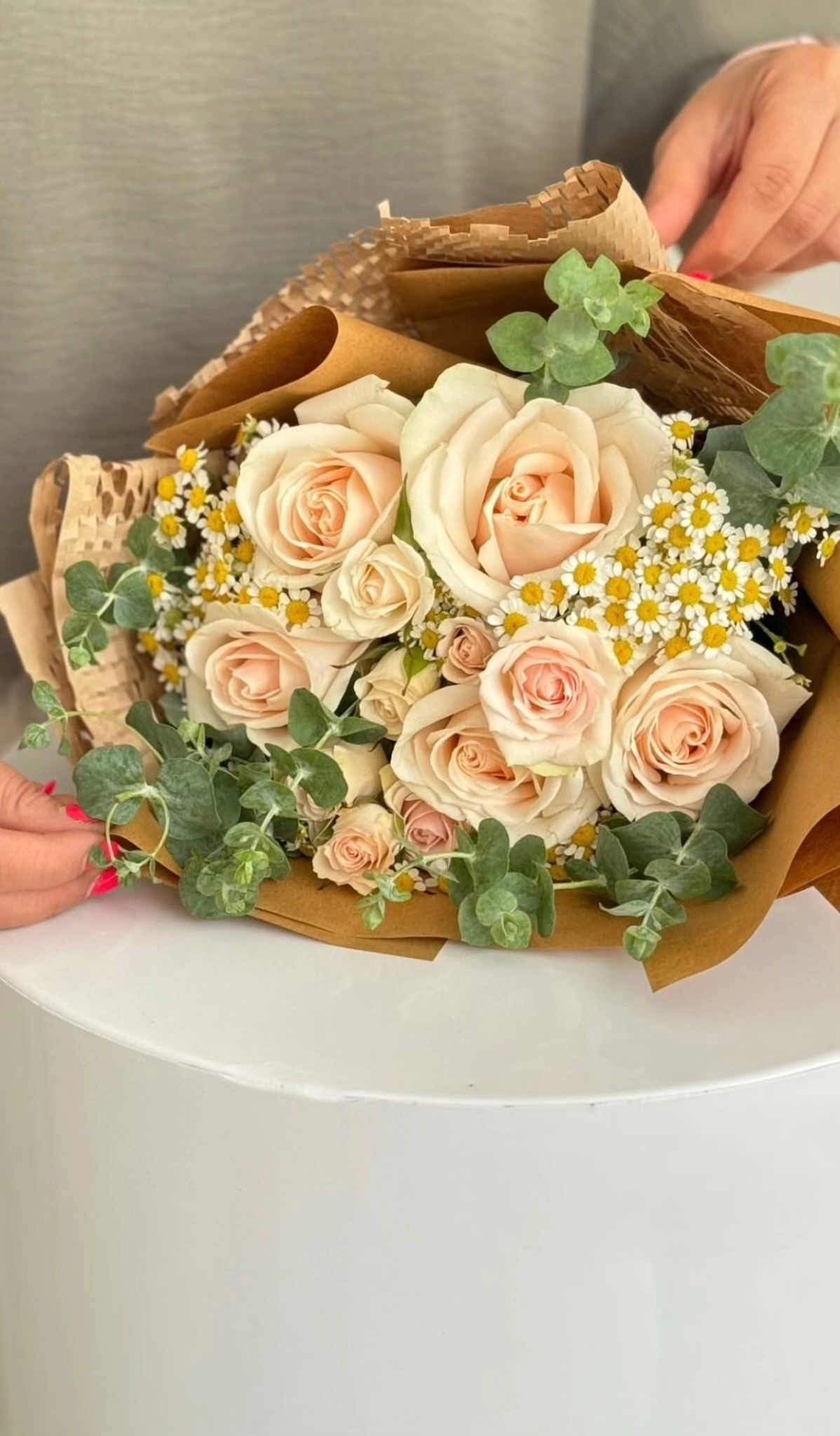 دسته گل رز و بابونه و اکالیپتوس فلوبار